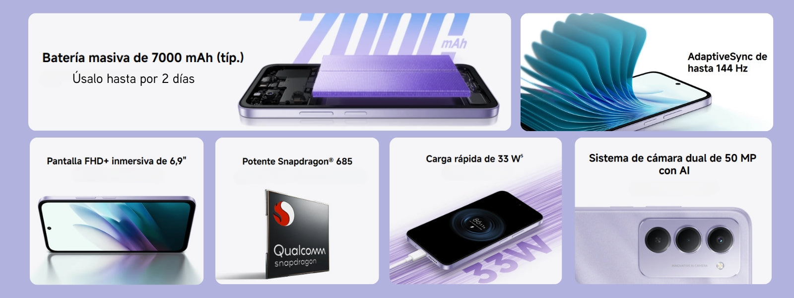 La batería de 7.000 mAh asegura un uso prolongado, con carga rápida de 33 W que alcanza el 50 % en minutos y opción de carga inversa de 18 W para otros dispositivos.