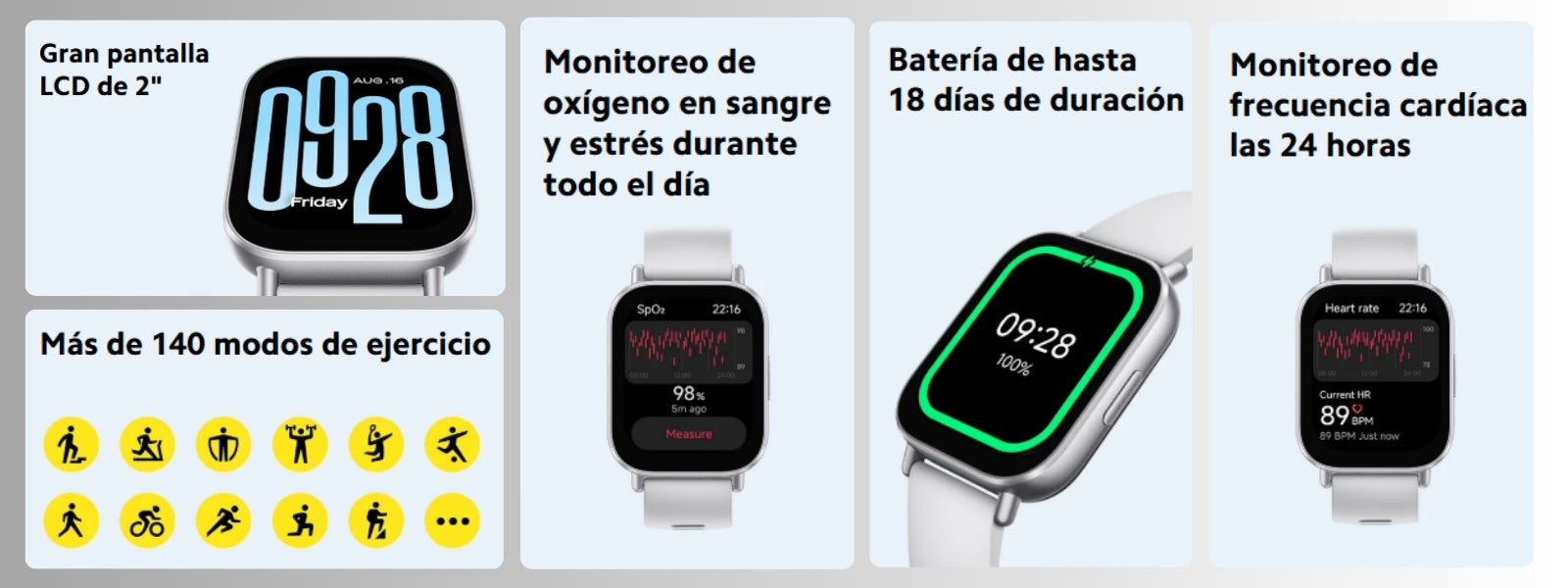 - Pantalla: LCD de 2" (320 × 385 px), brillo hasta 500 nits y ratio pantalla-cuerpo >70 %