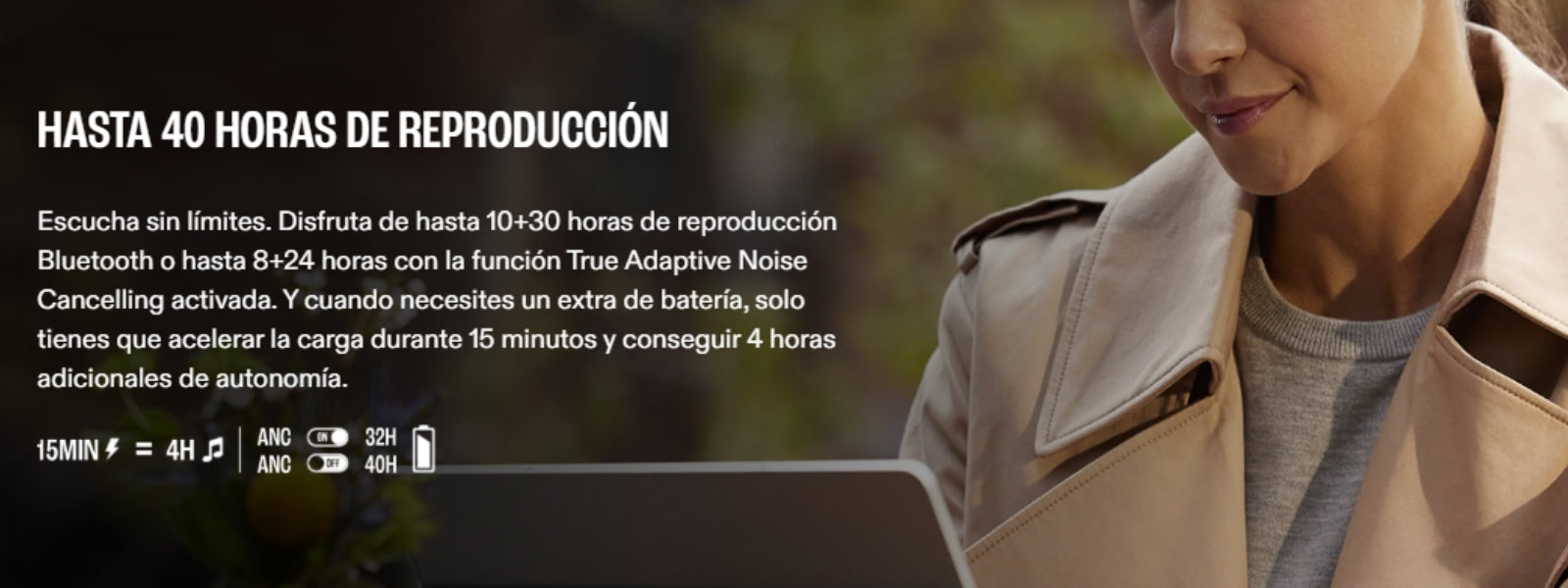 - Batería (auriculares): Hasta 10 h (ANC off), 8 h (ANC on)